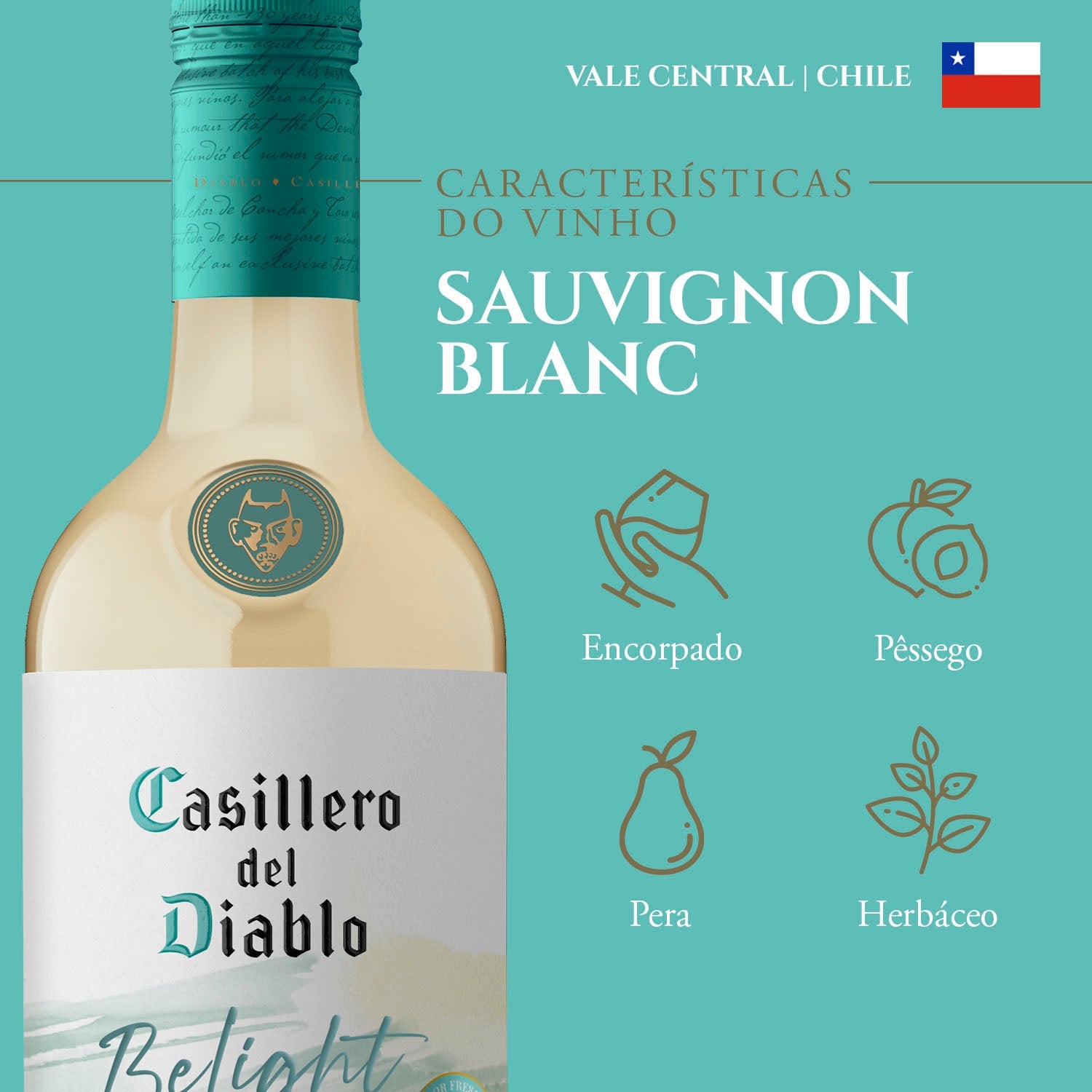 Sauvignon Blanc com sabores frutais e herbáceos, acidez vibrante, corpo leve e final longo e agradável
